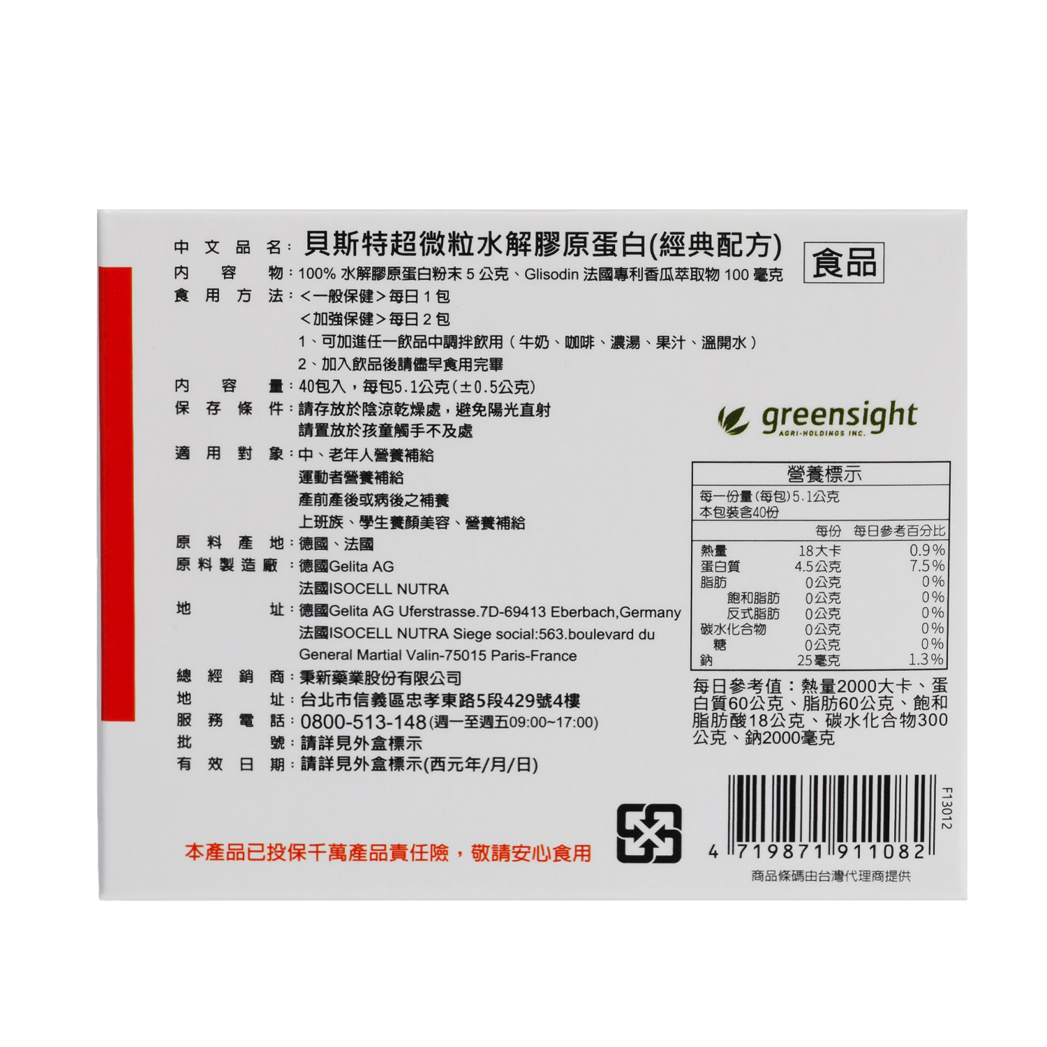 來自德國的98%高純度「水解膠原蛋白」無異味,不含任何添加劑